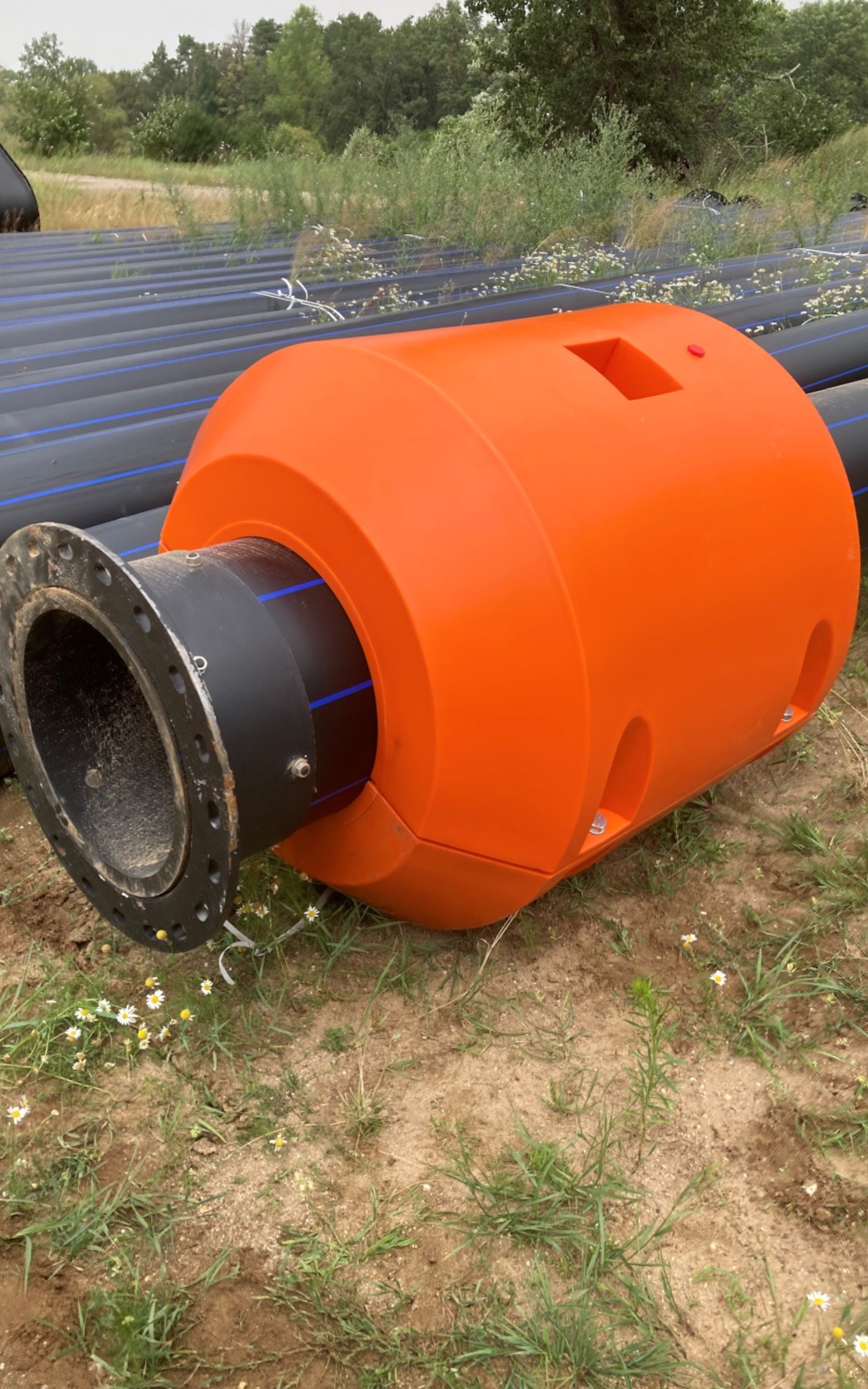 Float attachment: Floats are attached to welded pipe sections. They should be evenly spaced to ensure that the pipeline is stable and evenly lifted in the water. Remember to leave adequate gaps between the floats to avoid excessive pipe deflection.